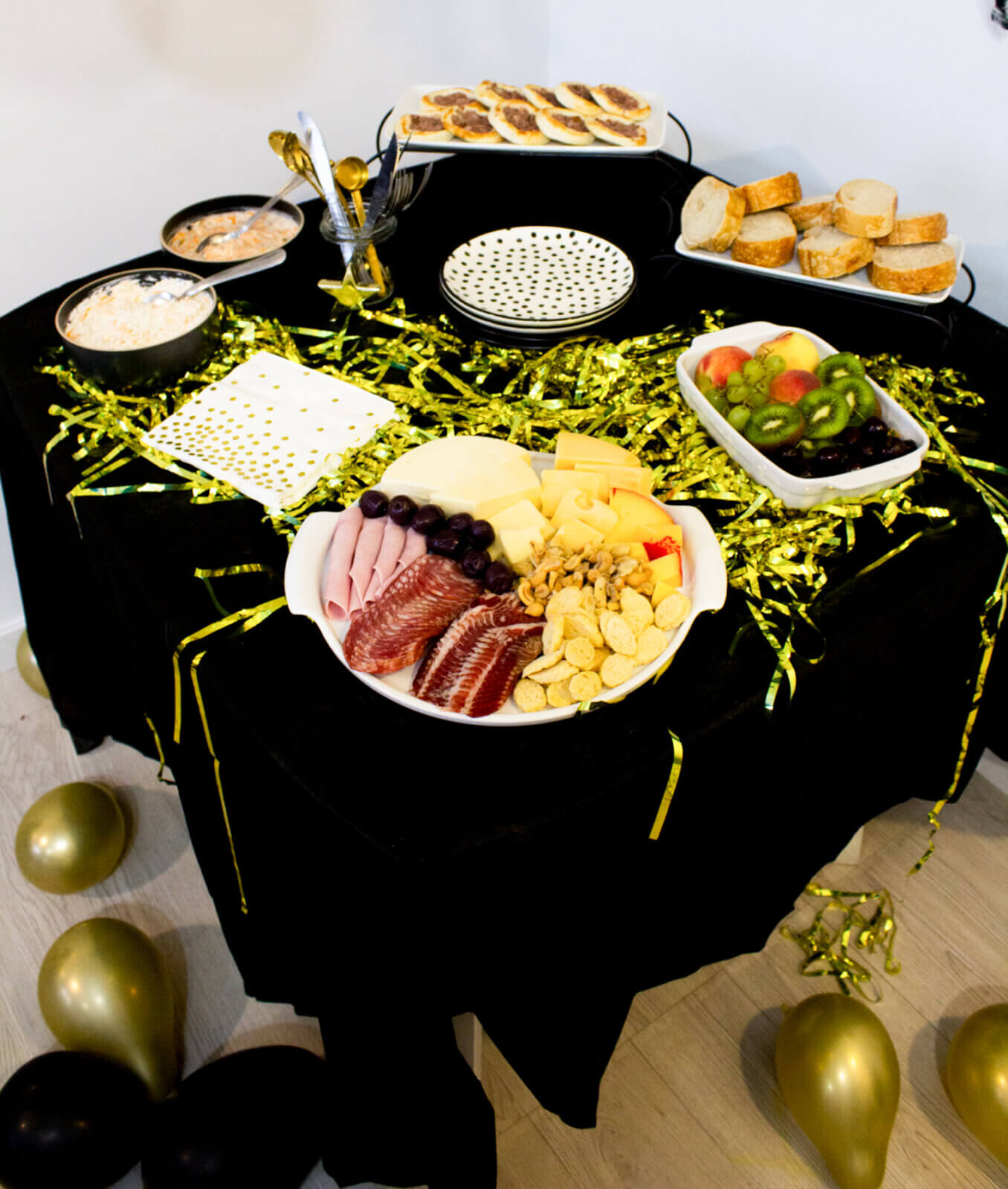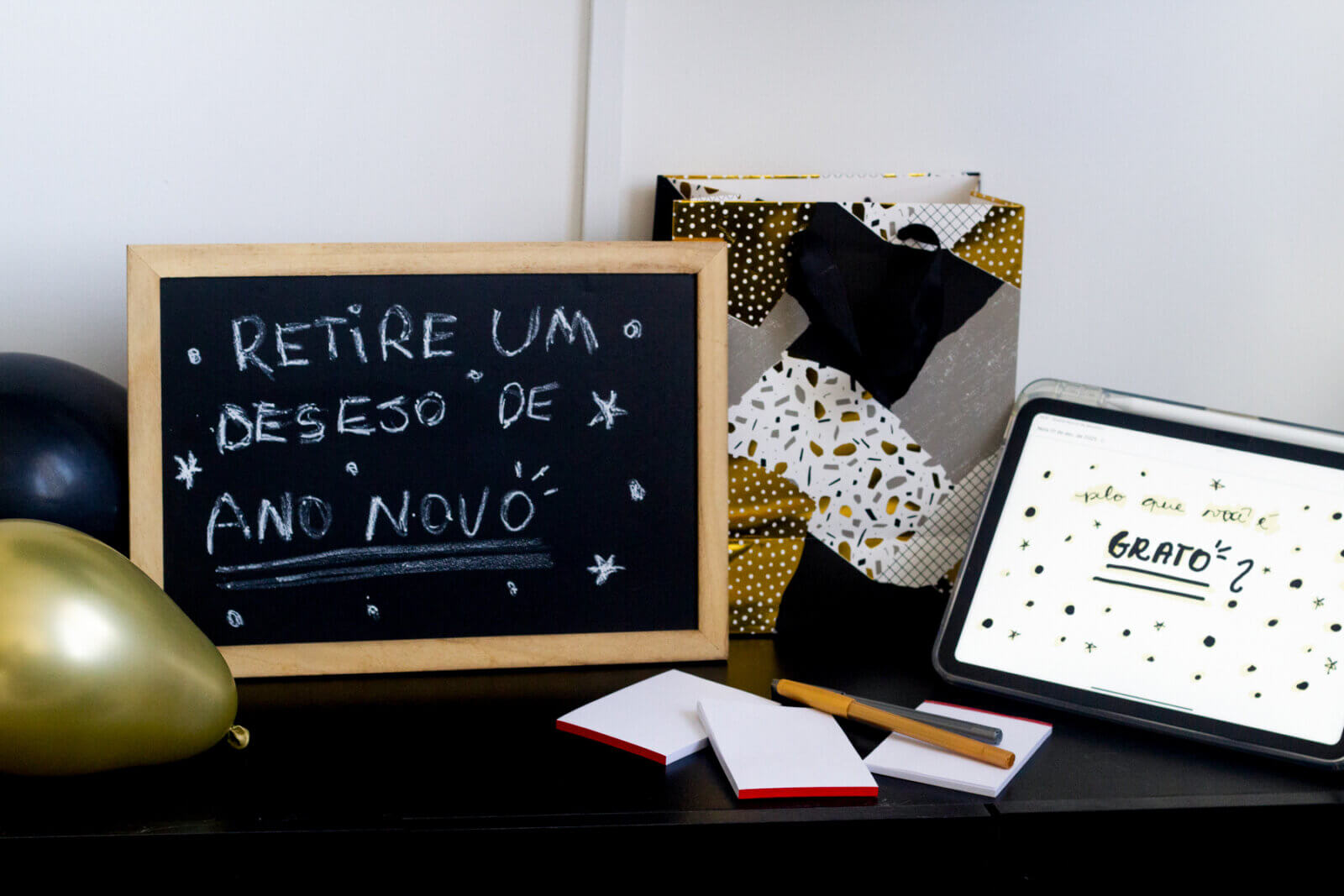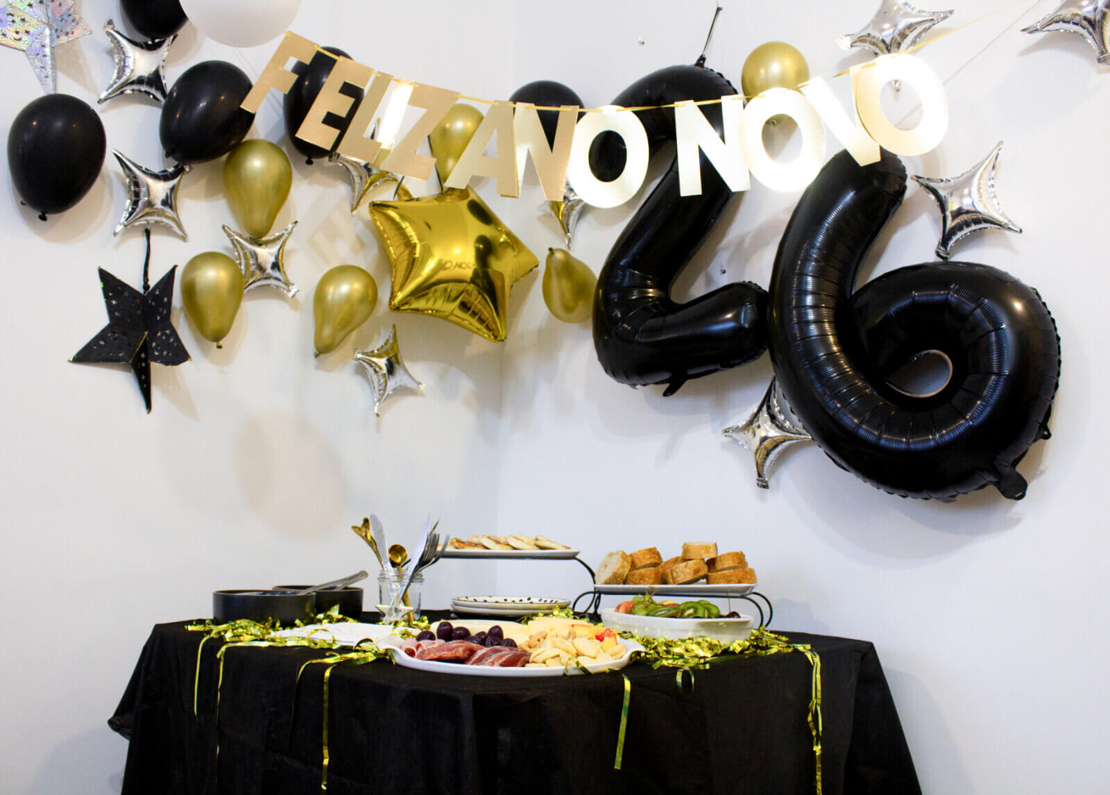 Como tradição, mantive a paleta de cores preta e dourada. Acredito que, além de elegante e bonita, ela representa bem a alegria e a finalização de ciclos — uma energia muito pertinente para esse momento. Para isso, usei algumas coisas que já tinha guardado do meu acervo, como as louças e a toalha preta. No entanto, também comprei algumas bexigas para montar um painel bem divertido na parede e uma cortina dourada, que trouxe um ar muito art déco para a festa.
