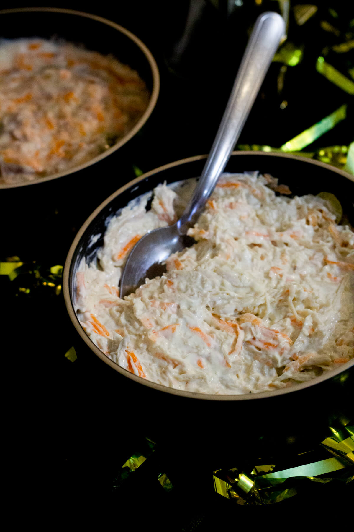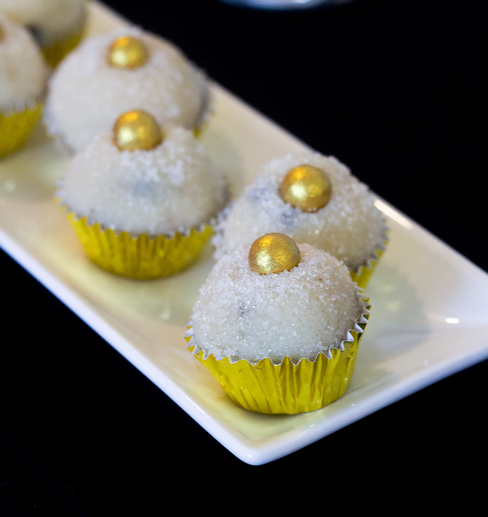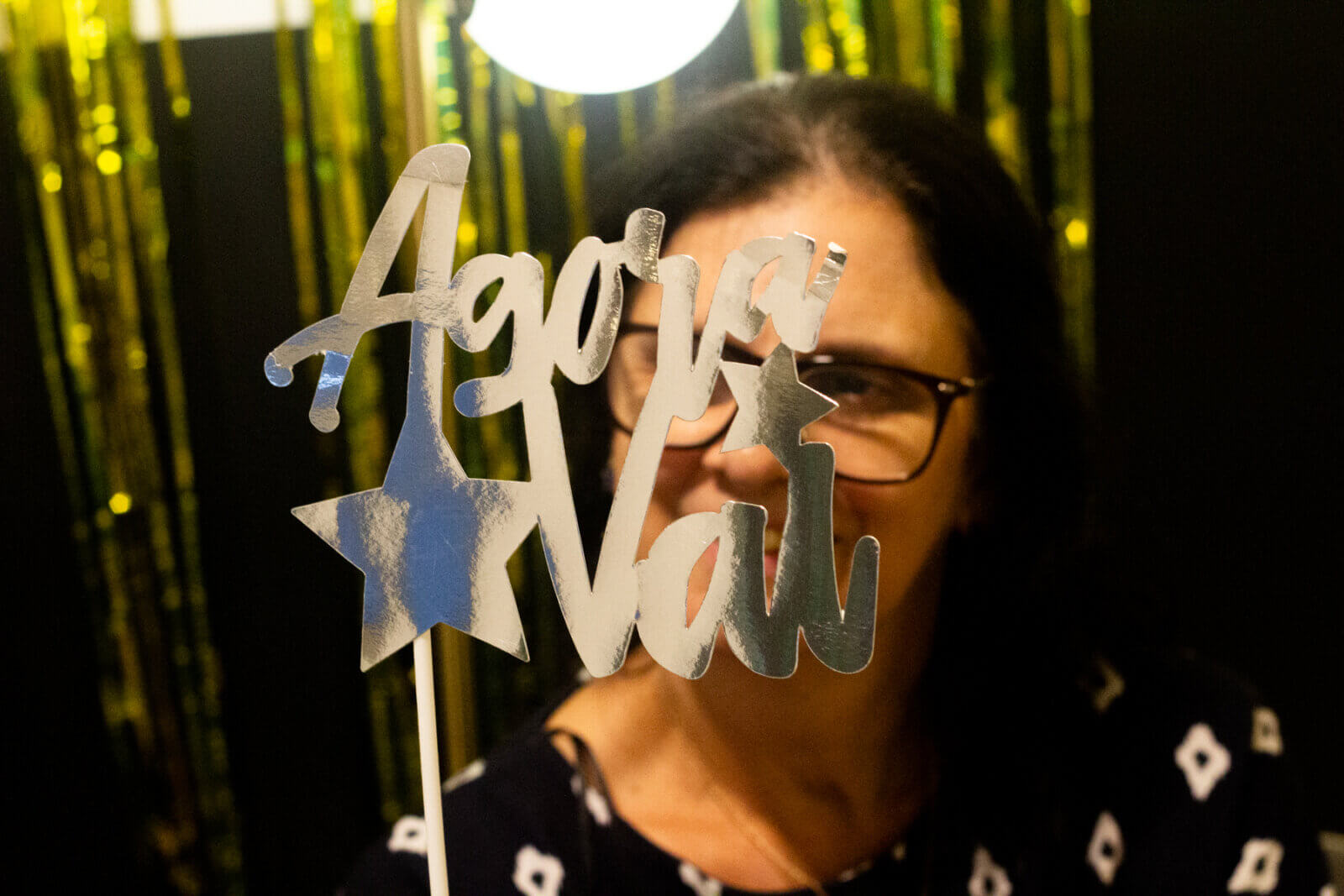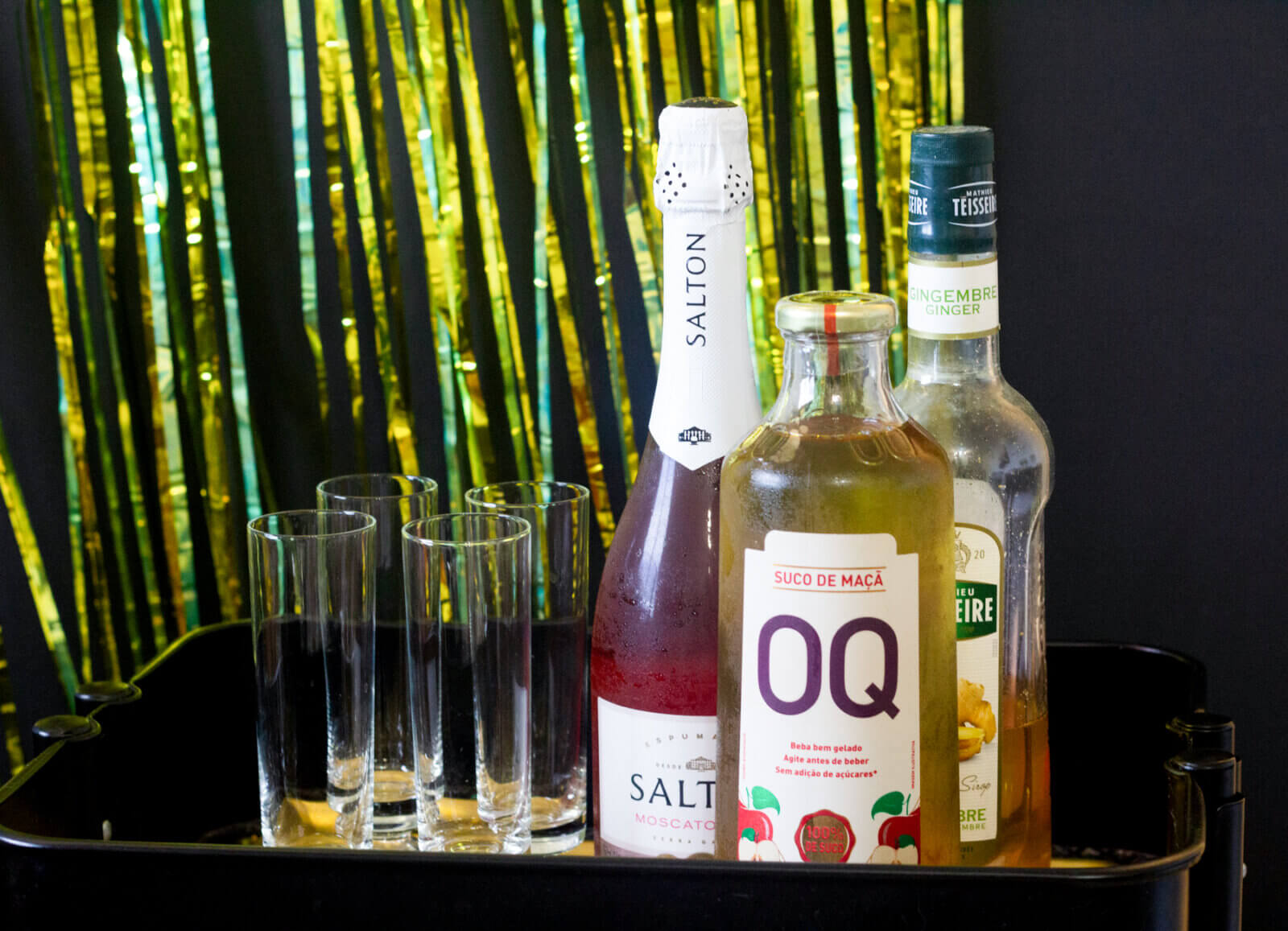 Como tradição, mantive a paleta de cores preta e dourada. Acredito que, além de elegante e bonita, ela representa bem a alegria e a finalização de ciclos — uma energia muito pertinente para esse momento. Para isso, usei algumas coisas que já tinha guardado do meu acervo, como as louças e a toalha preta. No entanto, também comprei algumas bexigas para montar um painel bem divertido na parede e uma cortina dourada, que trouxe um ar muito art déco para a festa.