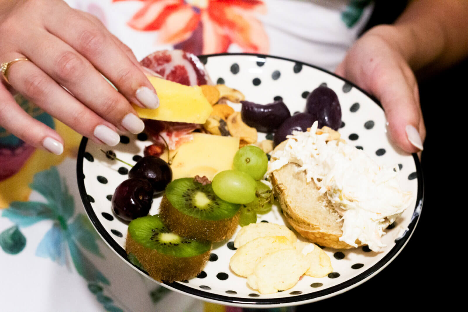 E, para o cardápio, priorizei coisas leves e práticas, pois estávamos no meio de uma onda de calor que tornou inviável ficar o dia todo na cozinha. Assim, comprei pequenas esfihas, fiz patês de frango e de atum para servir com pão italiano, além de uma tábua de queijos e frios e, claro, uma travessa de frutas. Esse é um exemplo de cardápio prático, que traz variedade e não é difícil de preparar.