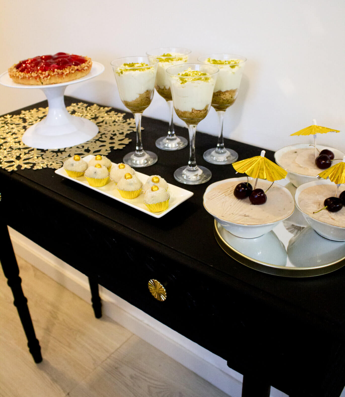 Já as sobremesas foram mais caprichadas. Como é algo que dá para preparar com antecendência, foi onde eu quis investir mais. Por isso preparei uma deliciosa torta de limão na taça, gelatina de cereja, brigadeiro de uva e comprei uma torta de morango. Queria uma mesa bem tropical, com muitas frutas, sabores ácidos e leves que trouxessem frescor e dulçor a nossa virada.